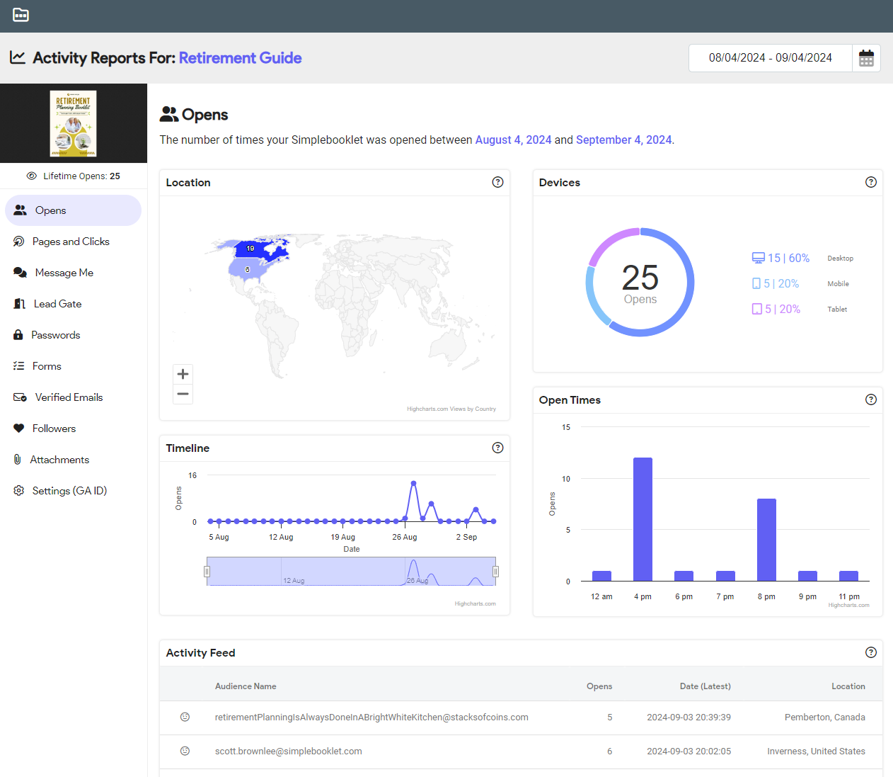 Get usable geographic location information and date and time activity for every person who interacts with your Simplebooklet, across any of the digital channels and devices you've shared.